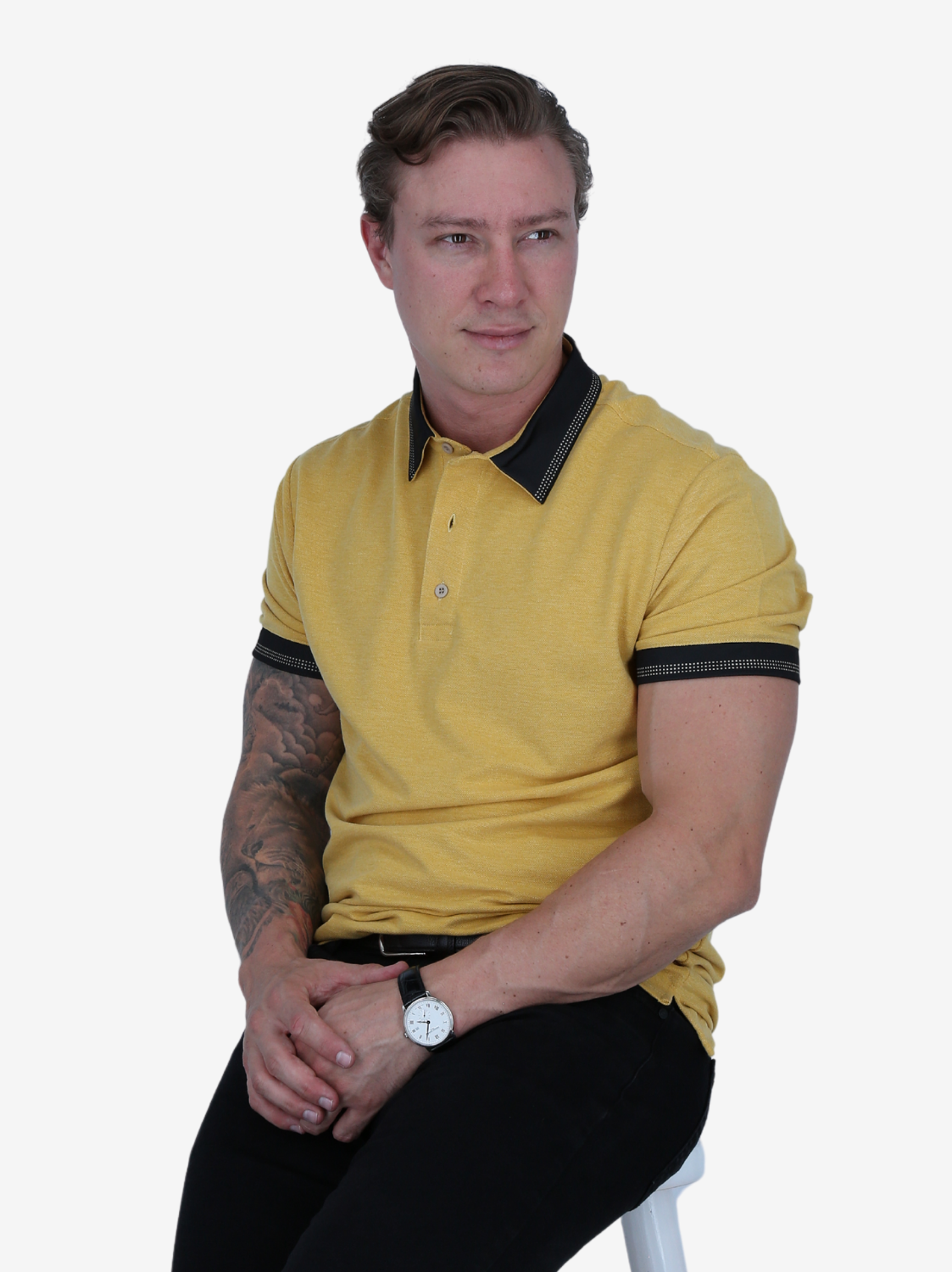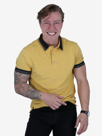 Polo box amarillo combinado. Diseño distintivo y tejido confortable. Estilo llamativo.