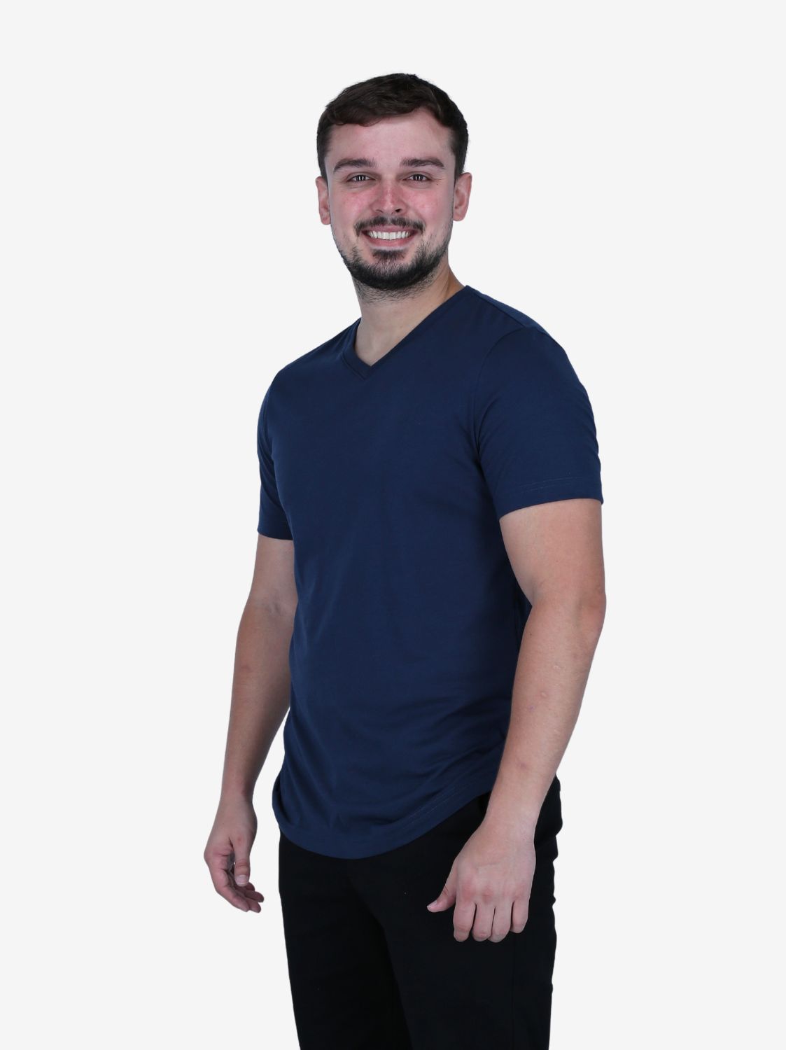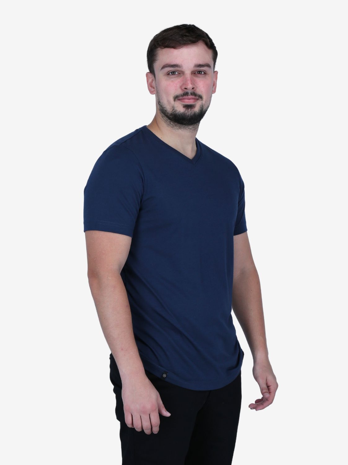 Camiseta de cuello en V azul marino de microfibra para varón. Tacto suave y confortable. Estilo clásico.