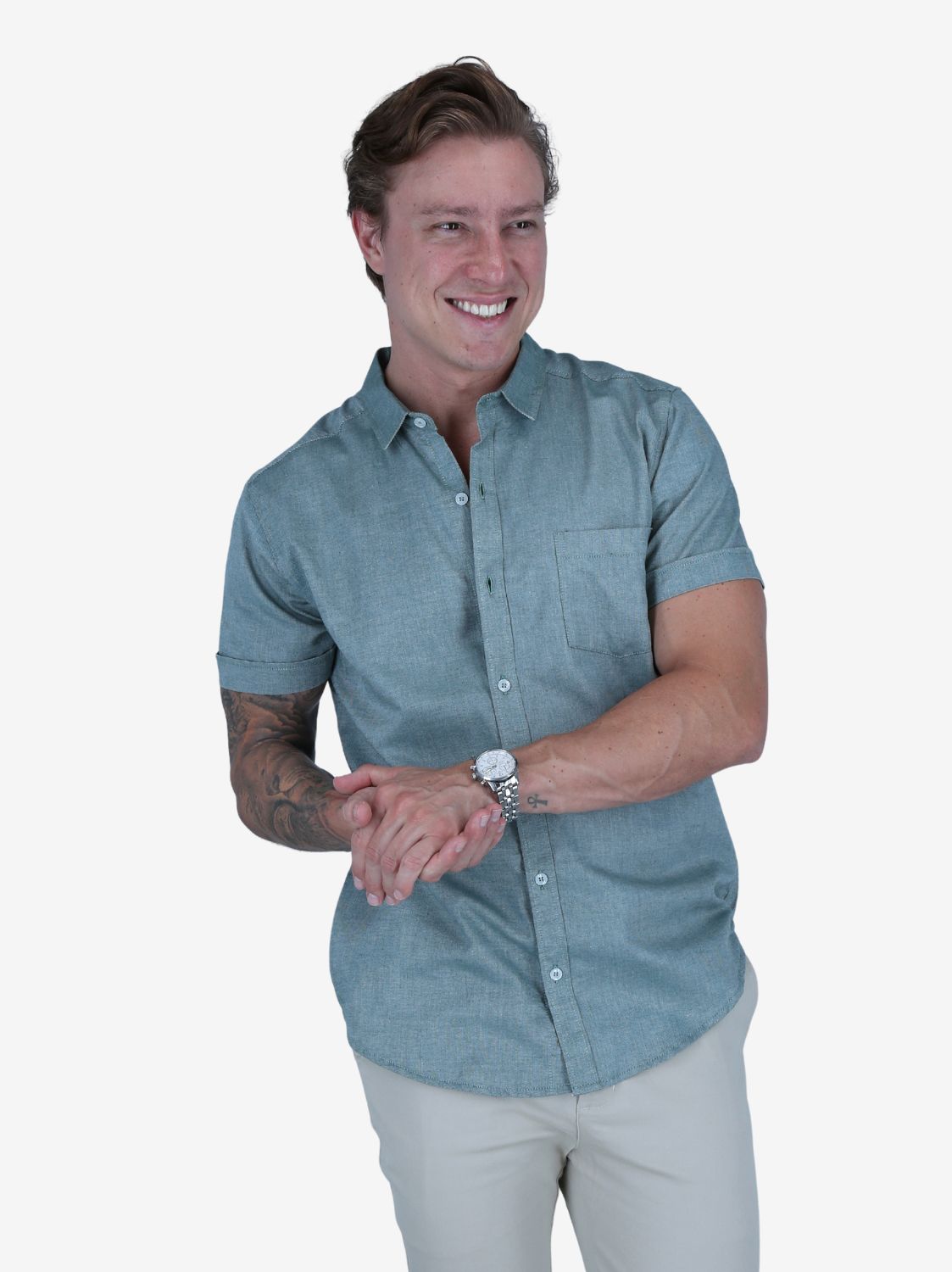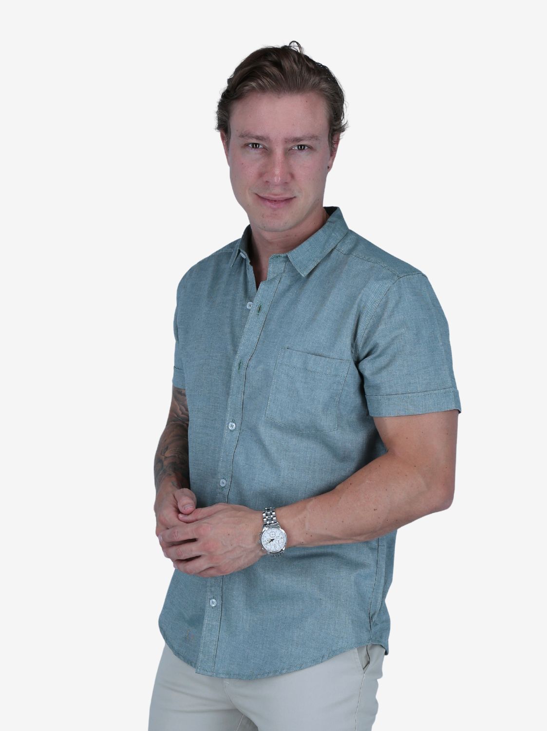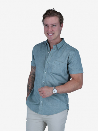 Camisa Slim verde musgo de manga corta para varón. Corte ajustado, diseño actual y estilo moderno.
