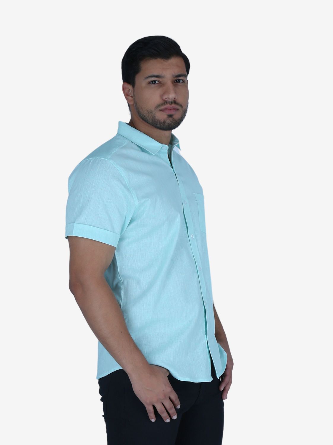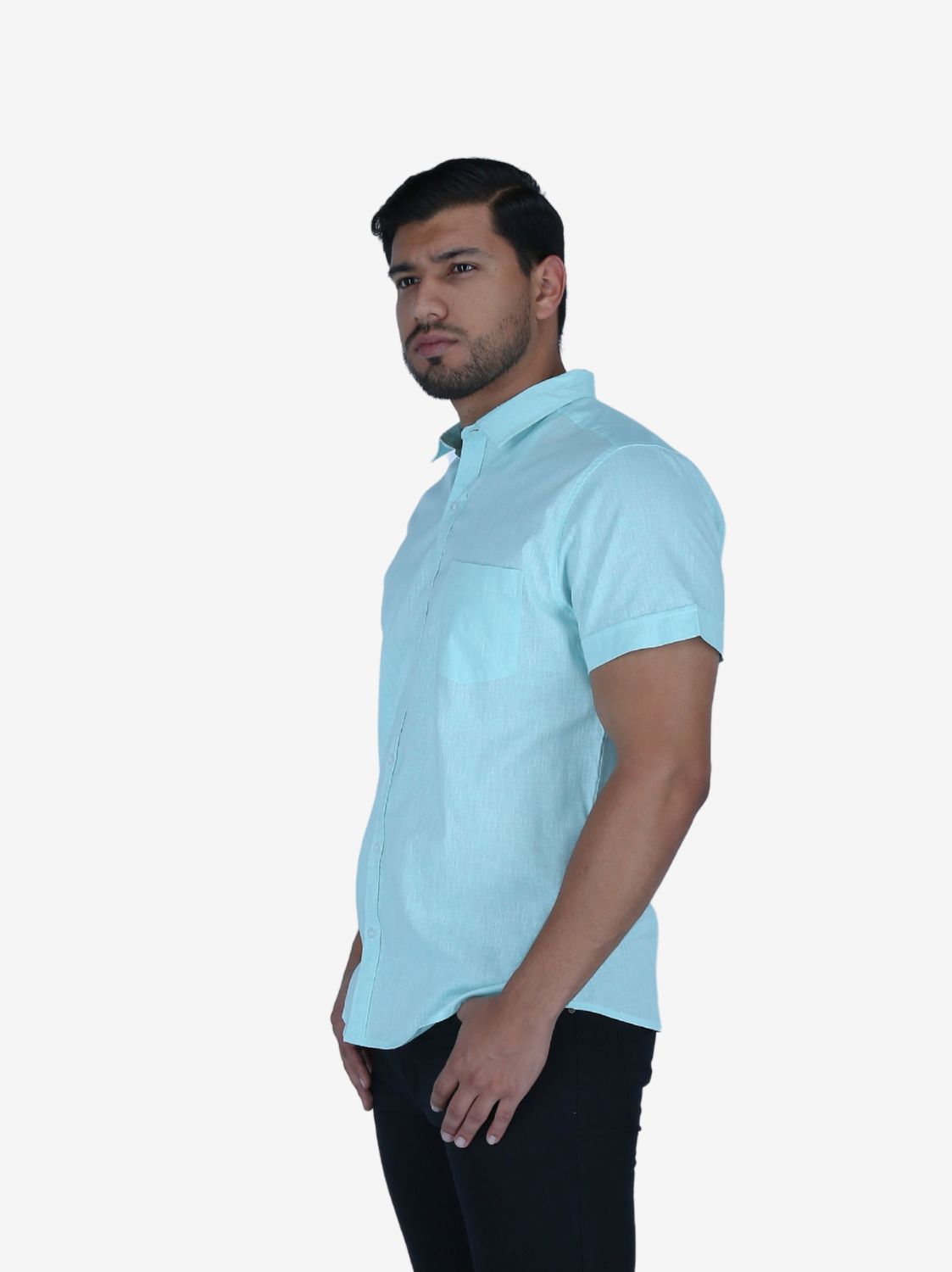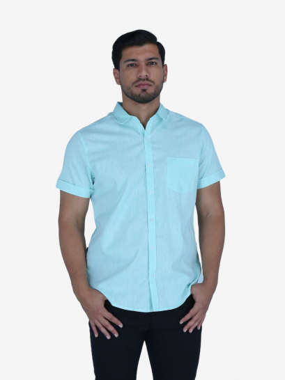 Camisa Slim verde agua de manga corta para varón. Corte ajustado. Diseño moderno. Estilo fresco.