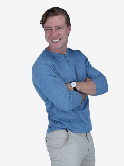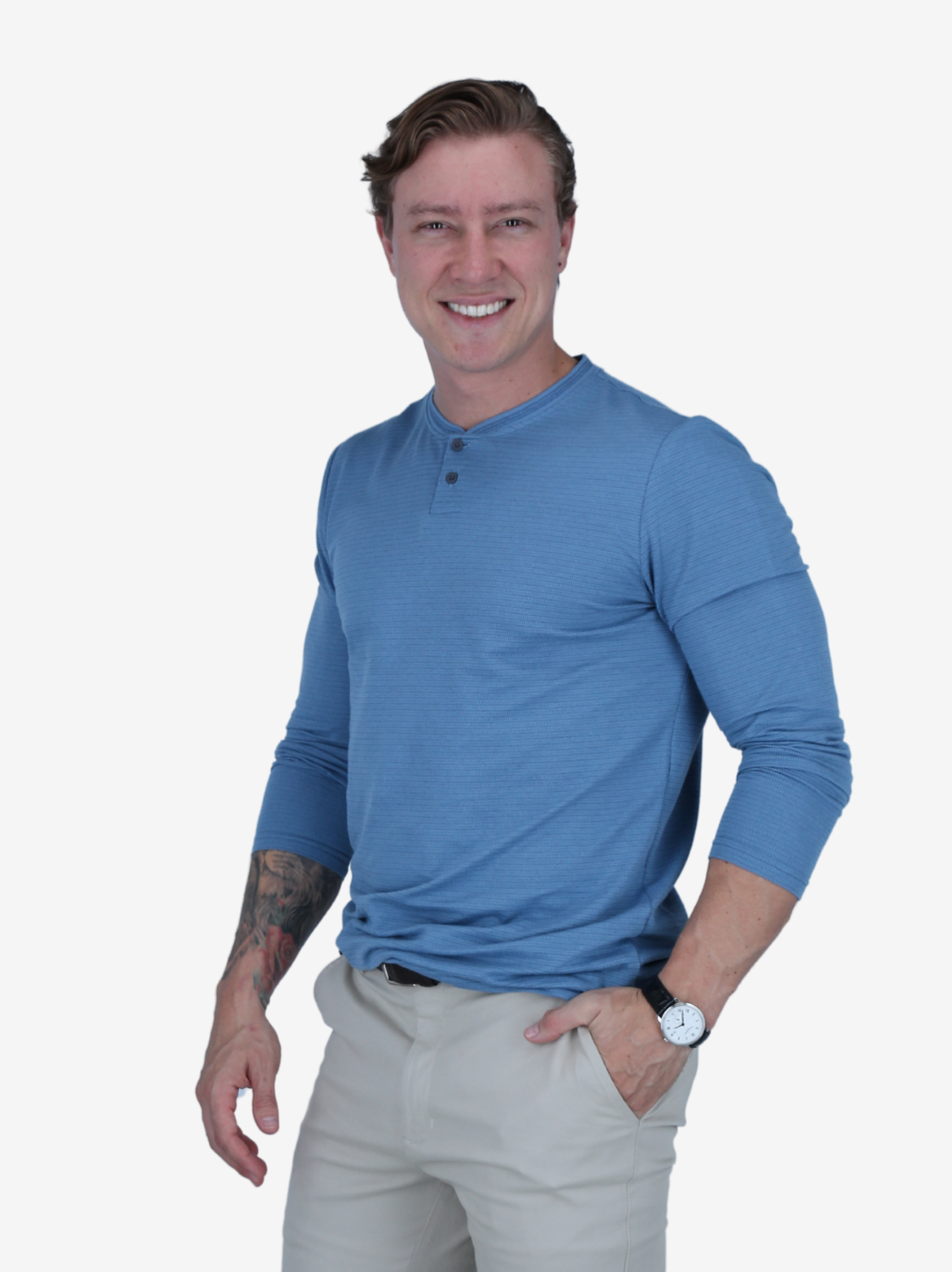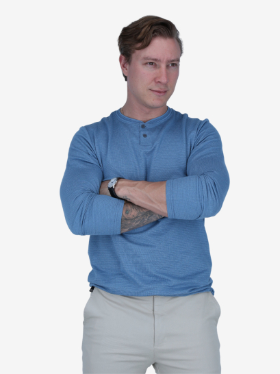 Camiseta Henley celeste de manga larga. Tejido suave. Diseño casual con botones. Estilo fresco.