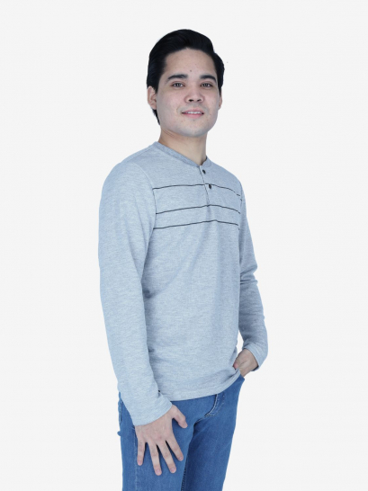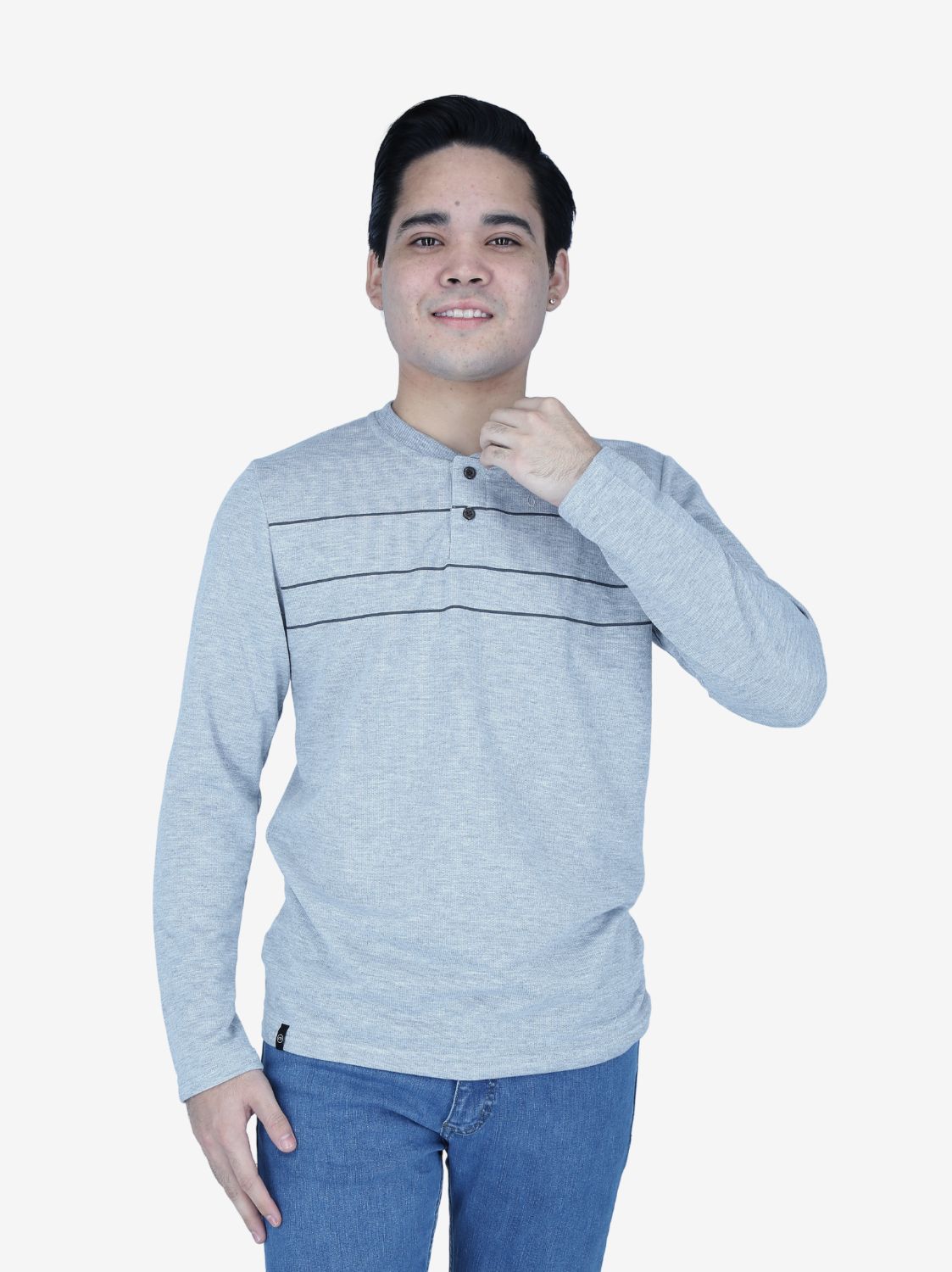 Camiseta Henley de manga larga en tejido Terry gris claro para varón. Tejido suave y cómodo. Diseño casual con botones en el cuello. Estilo relajado.
